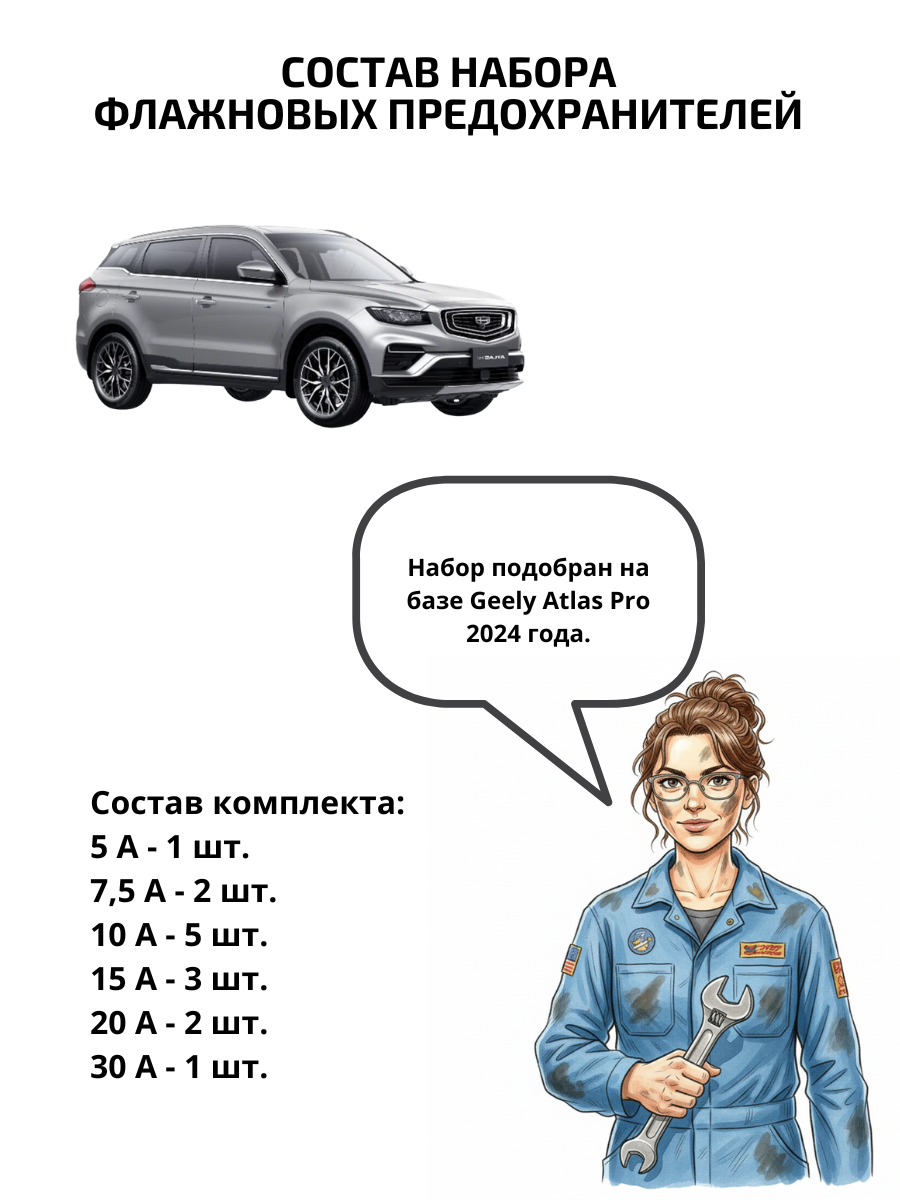 Покупая набор предохранителей для автомобиля Джили Атлас Про и Белджи X70, вы получаете: