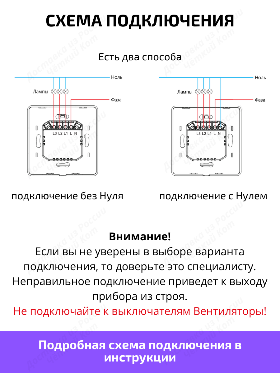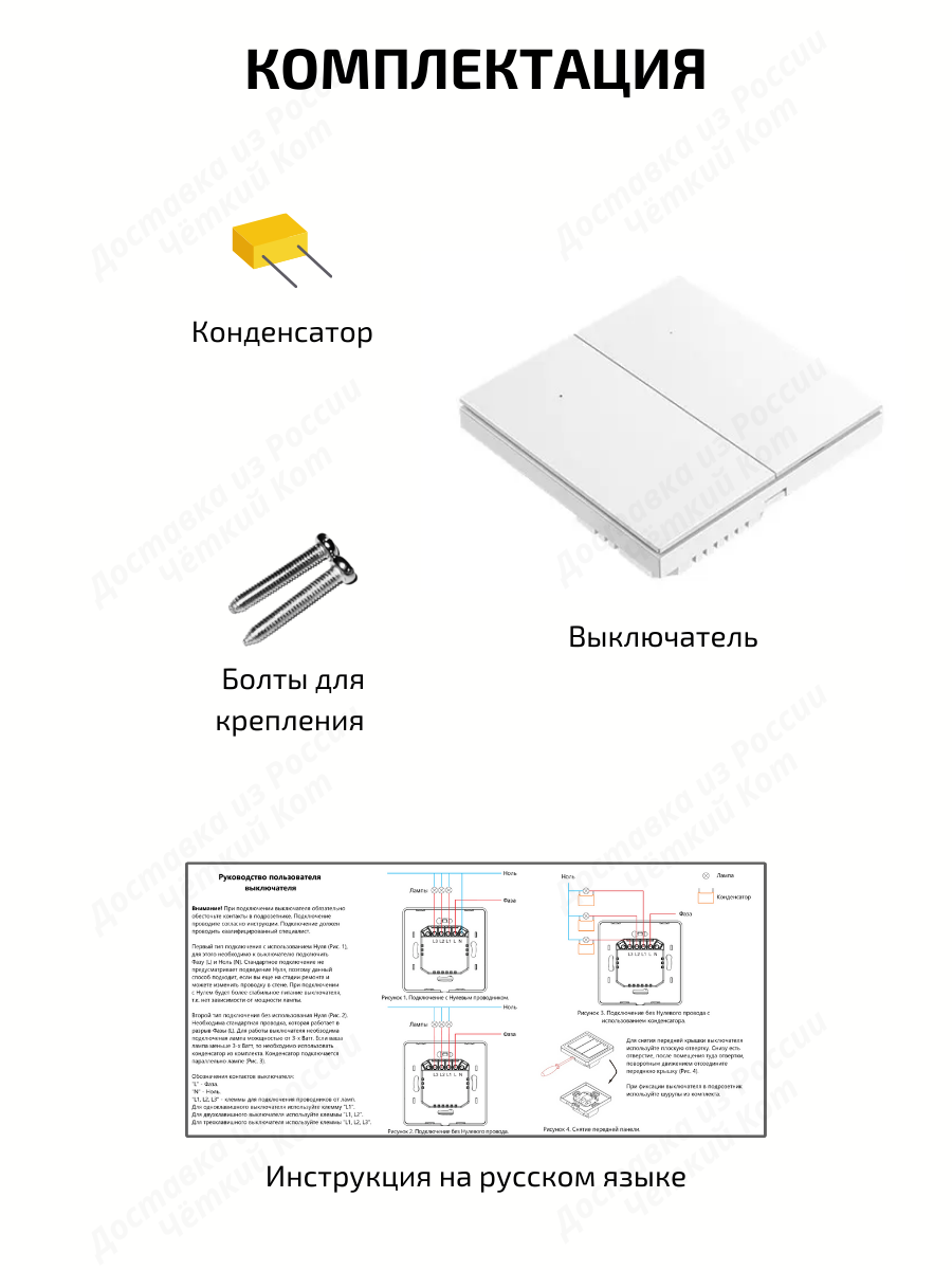 ВНИМАНИЕ! ЧИТАТЬ ПЕРЕД ЗАКАЗОМ! Дистанционный выключатель имеет вариант подключения с Нулем и без Нуля, т.е. он подходит в замен обычного выключателя. Смотрите схему подключения в картинках товара. В комплекте есть конденсатор для подключения без Нуля, есть инструкция.